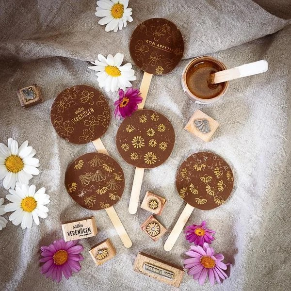 Afmetingen stempel: 1,2 x 1,7 cmAfmetingen houten blok: 2,0 x 2,0 cm