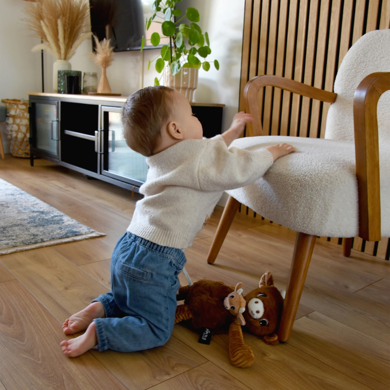 Deze bruine Ptipotos-knuffel is ideaal als cadeau voor een baby of kind. Ook oudere kinderen zullen verliefd worden op deze moeder met haar kind. De knuffelkoe is gemaakt van corduroy en is heerlijk zacht. De vulling is van gerecycled polyester.