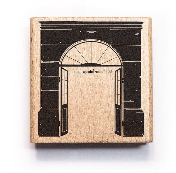 Cats on Appletrees stempel van de openstaande deur van een huis.