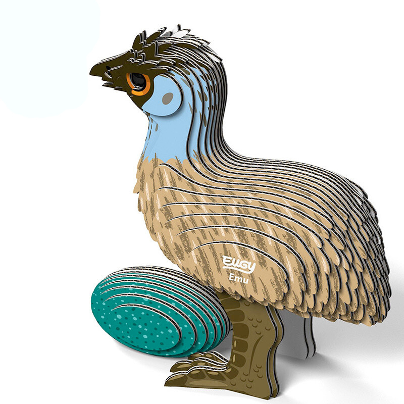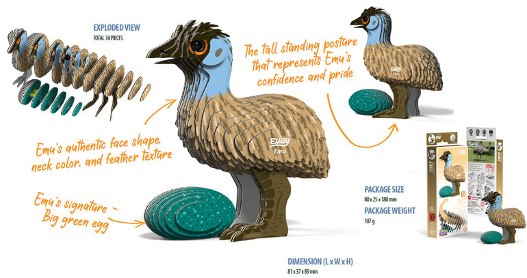Met Eugy kun je zelf stap voor stap je eigen gedetailleerde kleurrijke mini versie van de emoe elkaar zetten.