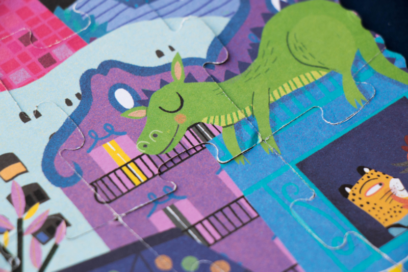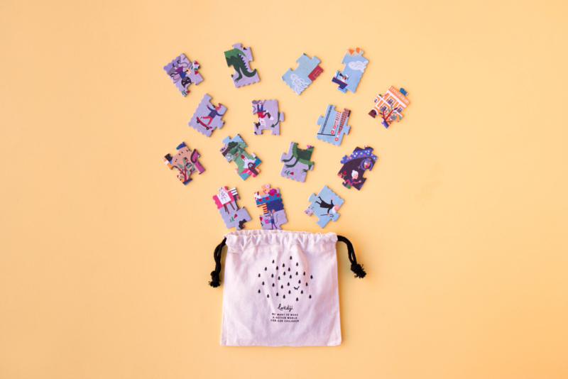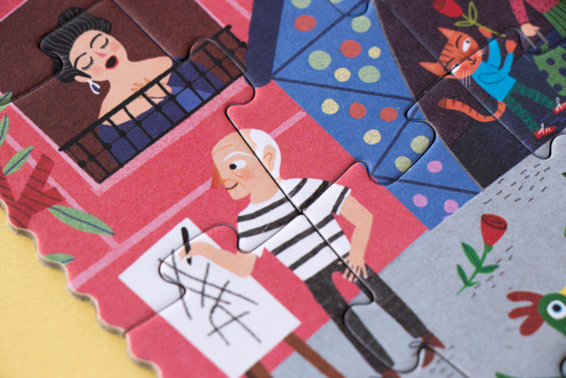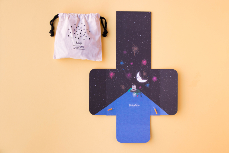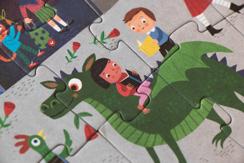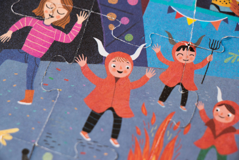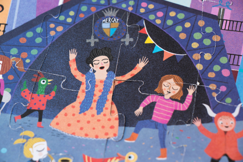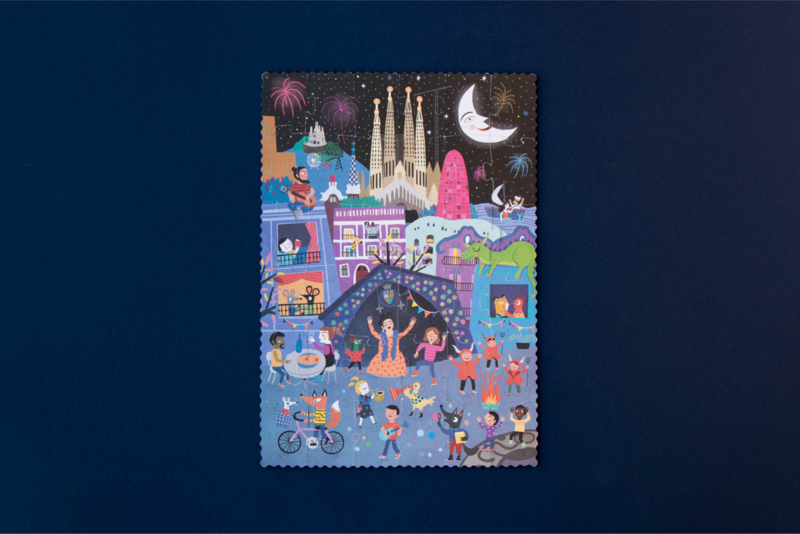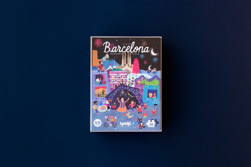 Een omkeerbare puzzel van 36 stukjes van Barcelona. Twee visies op de wonderstad: het Sant Jordi-festival overdag en de magische nacht van San Juan.