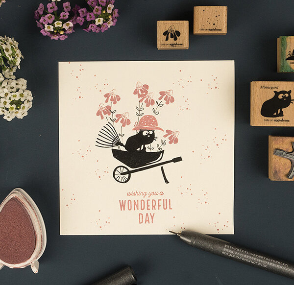 Cats on Appletrees stempel van een leuke hoed.