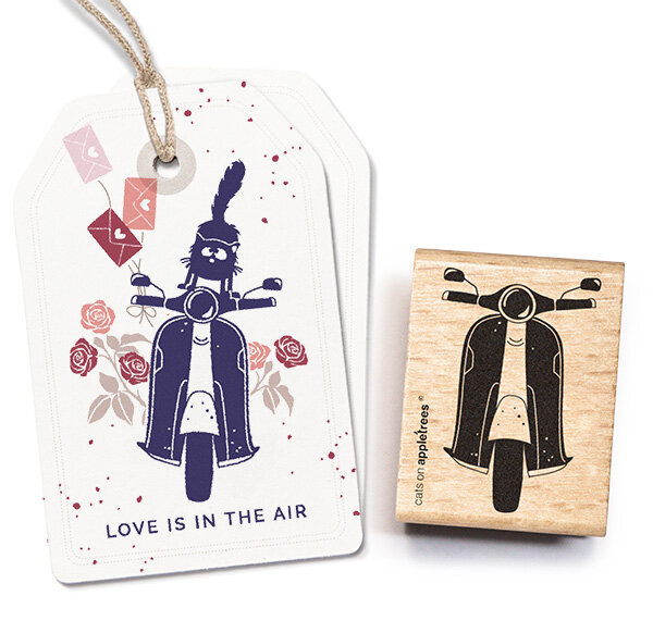 Cats on Appletrees stempel van een scooter. Afmeting stempel: 2,9 x 4,3 cm Afmetingen houten blok: 3,5 x 4,5 cm