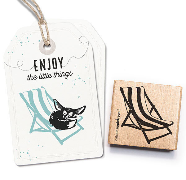 Cats on Appletrees stempel van een strandstoel. Afmeting stempel: 3,7 x 3,8 cm Afmetingen houten blok: 4,0 x 4,0 cm