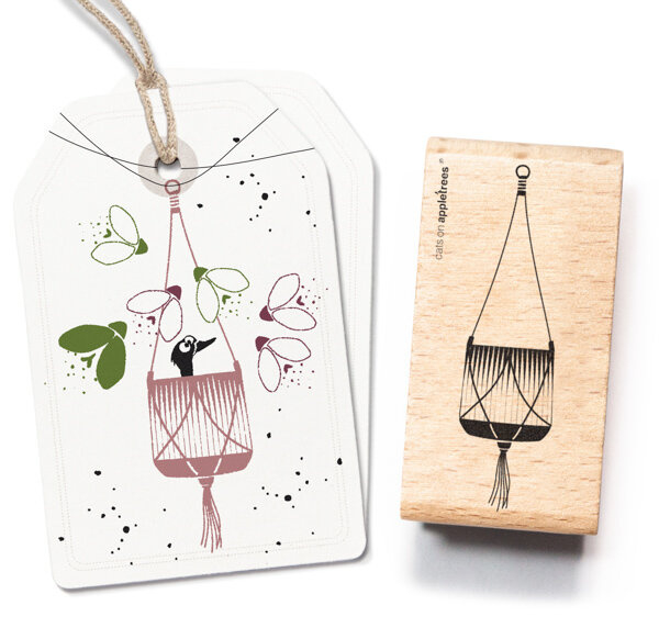Cats on Appletrees stempel van een grote hangende bloemenpot van macrame. Afmeting stempel: 6,7 x 1,9 cm Afmetingen houten blok: 7,0 x 2,5 cm