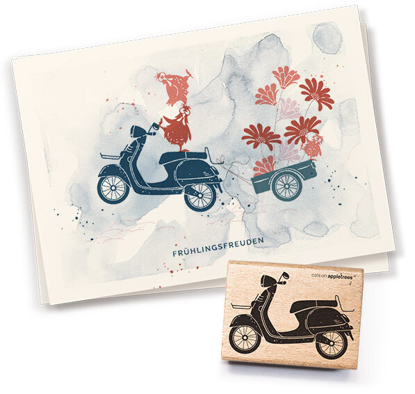 Cats on Appletrees stempel van een scooter. Afmeting stempel: 3,6 x 5,3 cm Afmetingen houten blok: 4,0 x 5,5 cm