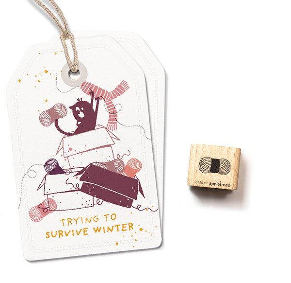 Cats on Appletrees mini stempel van een bolletje wol. Afmeting stempel: 1,2 x 0,6 cm Afmetingen houten blok: 1,6 x 1,6 cm